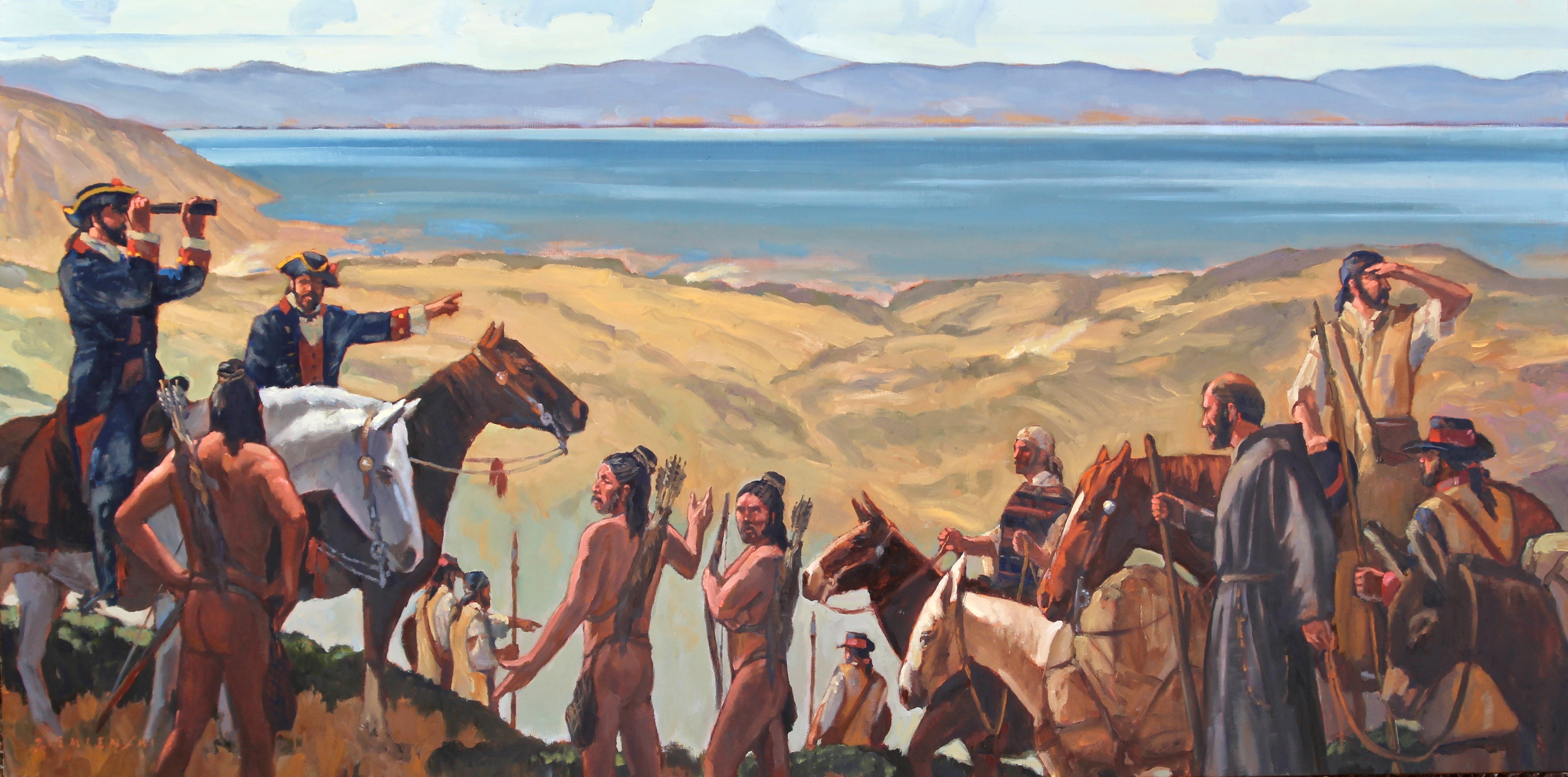 The De Anza Expedition set out with 240 colonists including 30 soldiers, 40 women — eight of whom were pregnant — and more than 100 children. The colonists were of diverse backgrounds, including a mix of Indigenous, European, and African heritage. The expedition also included vaqueros, muleteers, servants, Indigenous guides, friars, 695 horses and mules, and 385 Longhorn cattle. Father Pedro Font served as chaplain and diarist. His and De Anza’s meticulous records give us much of what we know about the journey today.