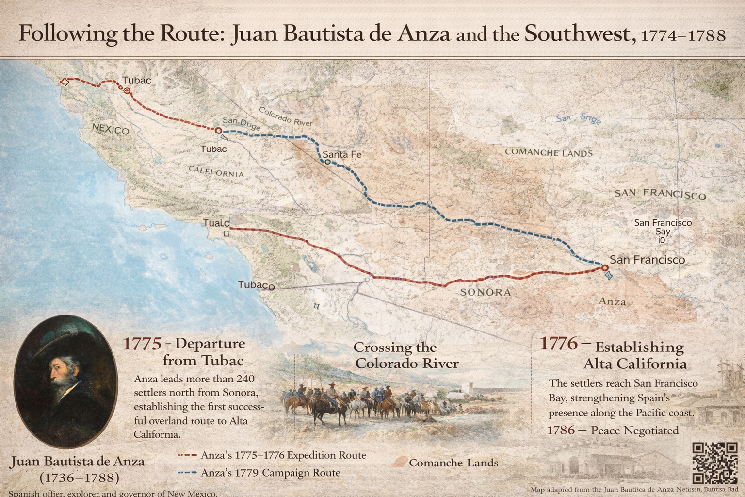 In 1775, many of the newly established California missions were in danger of collapsing due to food shortages and Indigenous resistance to missionization. Father Junípero Serra — president of all the California missions — argued that the missions required Spanish and Hispanicized settlers from New Spain to support them. The man chosen to lead them north was Lt. Col. Juan Bautista de Anza, who had already established an overland route from New Spain to Alta California in 1774, forging friendly relations with the Quechan (Yuma) people along the way.